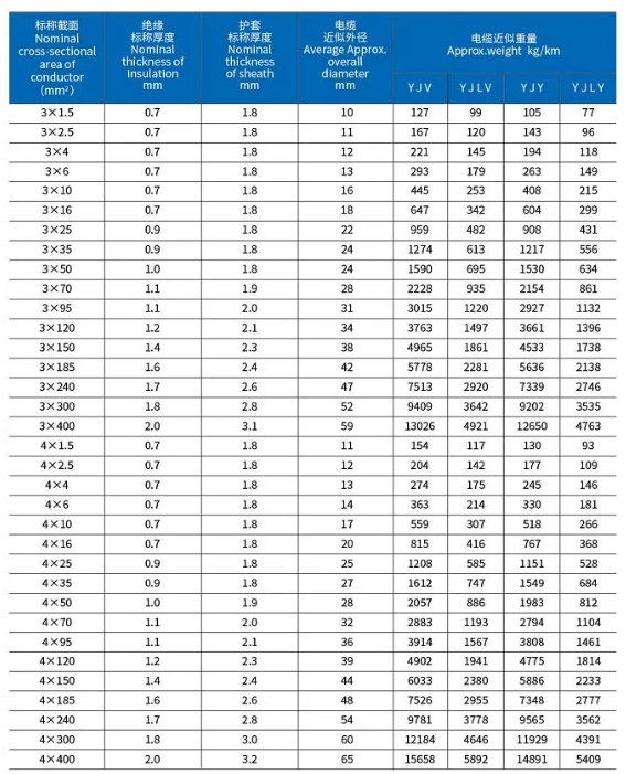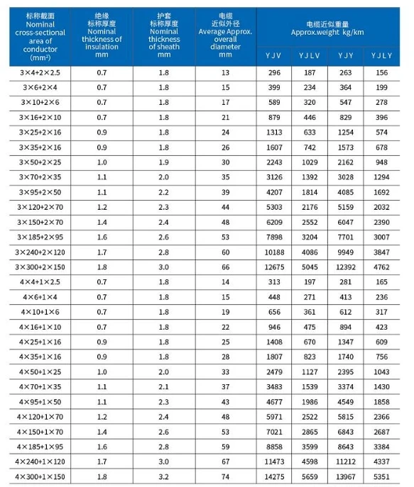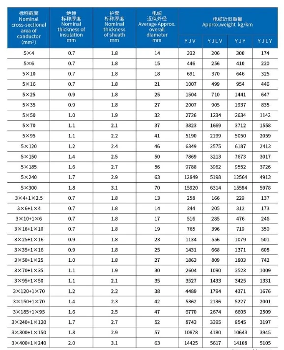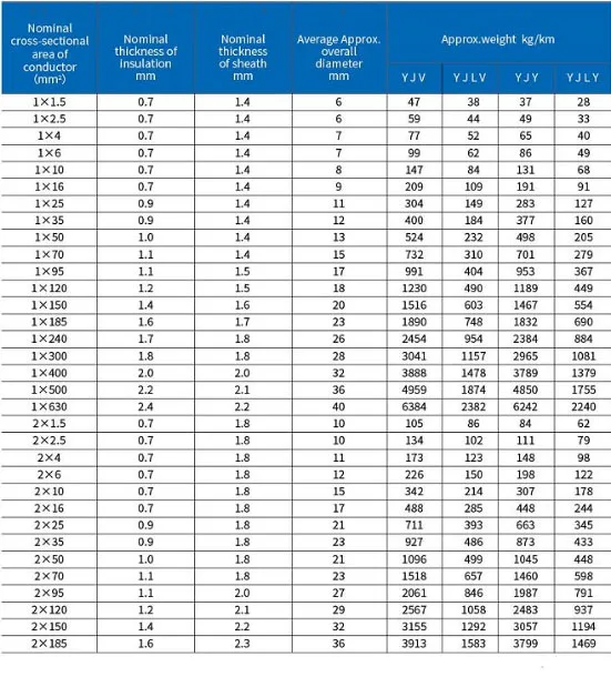 YJV-0.6/1kV: Single-core, double-core, three-core, four-core, five-core and other specifications are available.